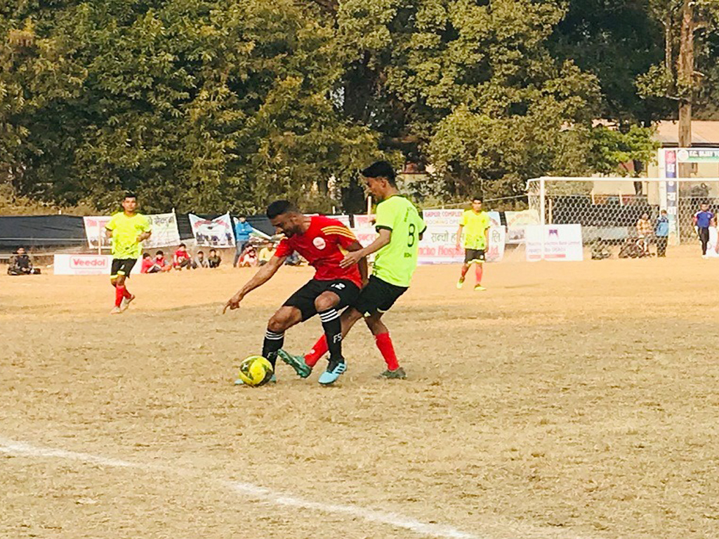 बागमती युवा क्लबको खेलाडी(रातो) र दूधौली स्पोर्टस क्लब सिन्धुलीका खेलाडी बलको लागि संघर्ष गर्दै ।