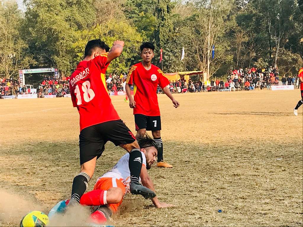 बल नियन्त्रणमा लिने प्रयासमा बागमती(रातो) र आयोजक खेलाडी सेतो जर्सीमा घम्साघम्सी गर्दै ।