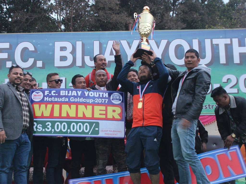 हेटौंडा-आयोजक विजय युथ क्लबले पहिलो संस्करणको हेटौडा गोल्डकपको उपाधि उचालेको छ । शुक्रबार बनविज्ञान अध्ययन संस्थानको खेल मैदानमा आयोजक विजय युथ क्लबले उत्कृष्ट पुनरागमन गदैै उपाधि लेखाउँदाँ सेन्ट्रल कलेज बिएफसी भरतपुर उपविजेतामा चित्त बुझायो । फाइनलमा भरतपुरलाई २–१ गोलअन्तरले स्तव्ध पार्दै आयोजकले उपाधि सिजनको पहिलो उपाधि आफनो पोल्टामा राख्दै प्रतियोगितालाई विट मार्यो ।