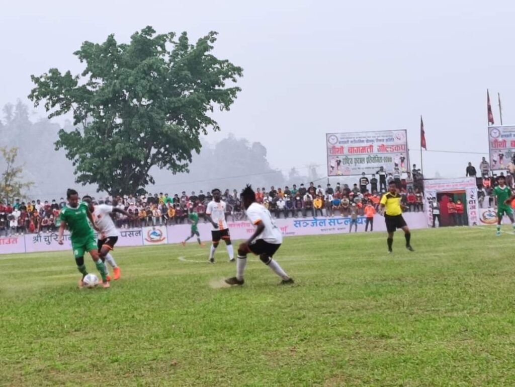 हेटौंडा-मकवानपुरको बागमतीमा जारी चौथो बागमती गोल्डकपको सोमबार भएको खेलमा अफ्रिकन रुट्स् एसोसिएसन क्यामरुन बिर्तामोड युनाइटेड झापालाई ४–१ गोल गर्दै विजयी भएको छ ।