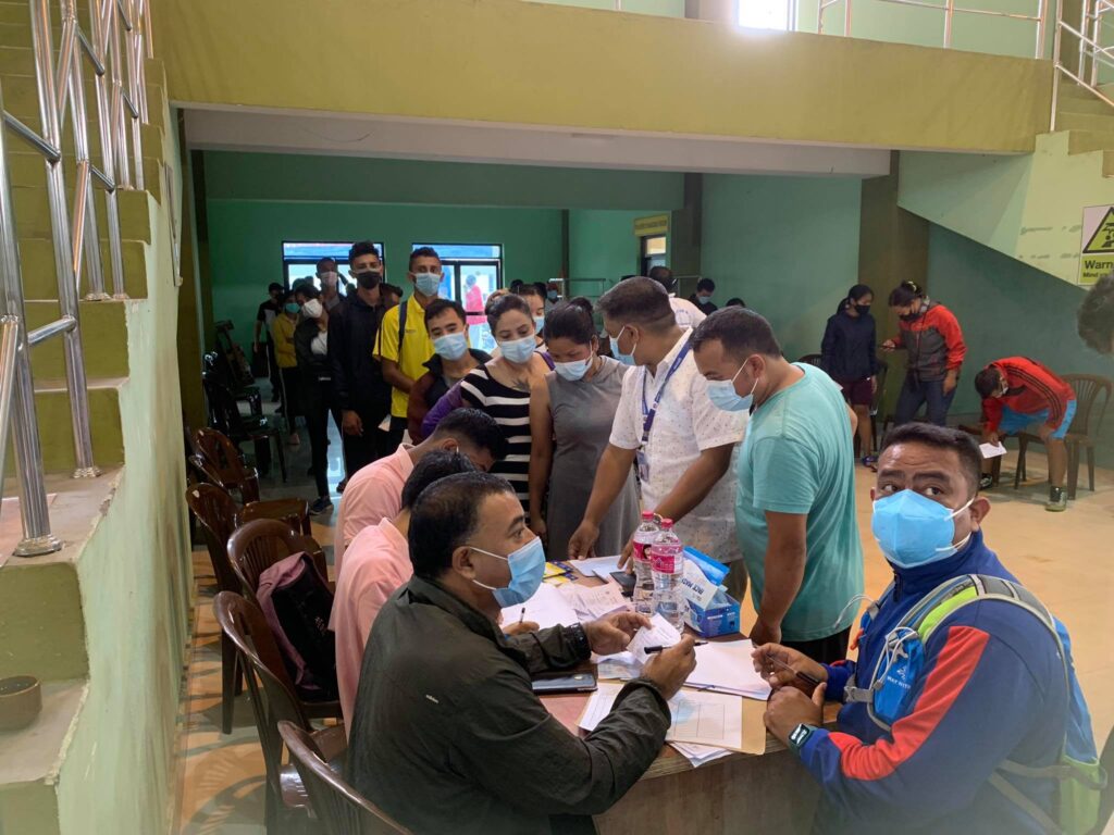 पोखरा रंगशाला बहुउद्देश्यीय कभर्ड हलमा खोप लगाउन नाम दर्ता गर्दै खेलाडीहरु ।