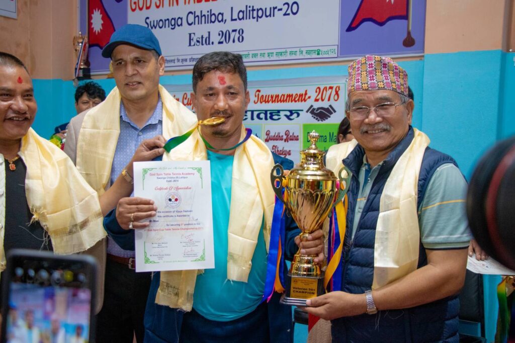 गोड स्पिन टेबलटेनिस एकेडेमीद्वारा आयोजित प्रतियोगिताको पुरुष एकल ६० वर्षमाथि भेट्रानमा जगदिश्वर जोशीले स्वर्ण, उदयमोहन श्रेष्ठले रजत तथा रोशन प्रधान र खगेन्द्र ढकालले कांस्य जिते । ४० वर्षमाथि जयराम महर्जन प्रथम, उमेश मानन्धर द्वितीय तथा नरेश रावल र ज्ञानेश्वर महर्जन तृतीय बने । ५० वर्षमाथि किरण व्यञ्जन्कार, नदिम शाक्य तथा प्रकाश धाख्वा र किरणमुनि वज्राचार्य क्रमशः शीर्ष तीन स्थानमा रहे ।