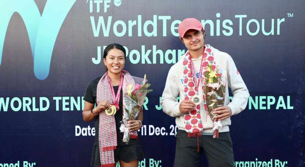 आईटिएफ विश्व टेनिस टुर जुनियर ५ पोखरा च्याम्पियन तामाङ र जेलकोस्की पदक ग्रहणपछि ।