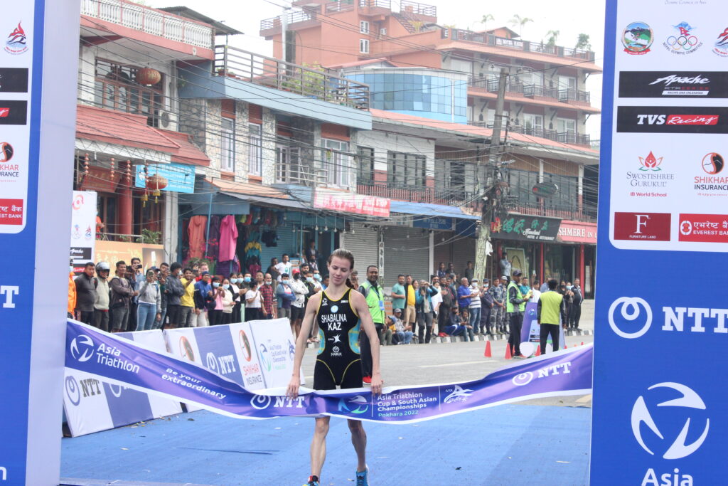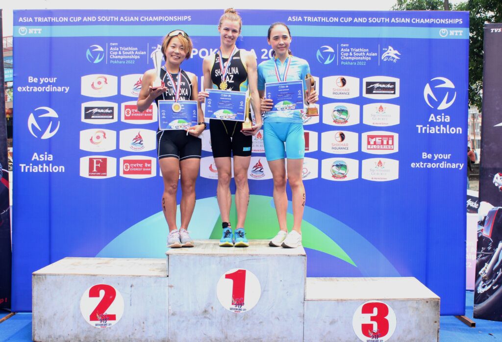 महिला तर्फको प्रतिस्पर्धामा काजाकास्तानकी इकातेरिना शाबालिनाले १ घण्टा २ मिनेट २० सेकेण्डको समय लगाउँदै एशियन कप ट्रयाथोलन च्याम्पियन बनिन् । त्यसैगरी जापानकी हिराकु फुकुओका दोस्रो भईन् । उनले १ घण्टा २ मिनेट ५३ सेकेण्डको समय लगाईन् । काजाकास्तानकी नाडेज्दा बेक्मागान्वेतोभाले १ घण्टा ४ मिनेट १४ सेकेण्डको समय लगाउँदै तेस्रो स्थान प्राप्त गरिन् । पौडी फेवातालमा गराइएको थियो । दौड गौरीघाट–शहीदचोक–गौरीघाटमा पुगेर टुंगिएको थियो ।
