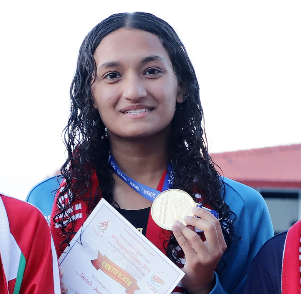 त्यस्तै १०० मिटर फ्रि स्टाईलमा डंगोलले १ मिनेट २ः८४ सेकेन्डको समय निकाल्दै स्वर्ण हात पारिन् । त्यस्तै आर्मीकी अनुशिया तन्डुकारले १ मिनेट १ः८३ को समय निकाल्दै रजत जित्दा पुलिसकी मेगन गुरूङले १ मिनेट ६ः२ को समय निकाल्दै कास्य जितिन्। । डंगोलले २०० मिटर ब्याकस्ट्रोकमा २ मिनेट ३६ः४ सेकेन्डको समय निकाल्दै स्वर्ण जितिन् ।