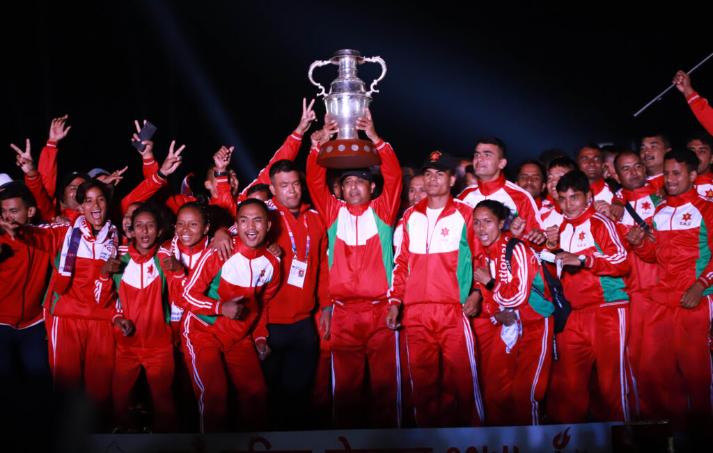 पोखरा-नवौं राष्ट्रिय खेलकुद प्रतियोगिता बिहीबार साँझ अबेर समापन गरियो । नेपाल आर्मी च्याम्पियन बन्यो । पोखरामा भएको राष्ट्रिय खेलकुदको मेलामा आर्मीले १७२ स्वर्ण पदक जित्नै च्याम्पियन बनेको हो । च्याम्पियनसँगै आर्मीले राष्ट्रिय प्रतियोगिताको च्याम्पियनसीप ट्रफी(रनिङ शिल्ड) उचाल्यो ।