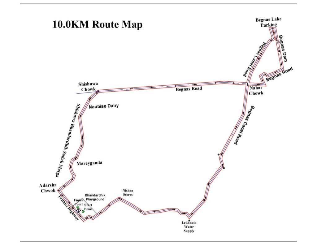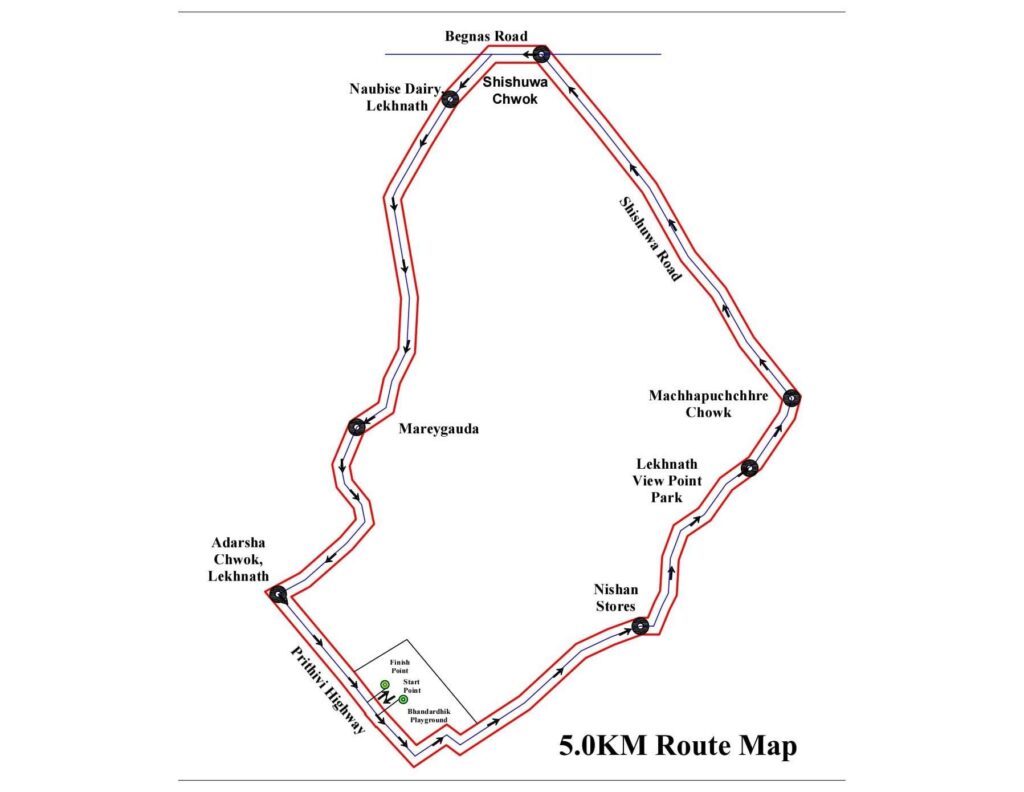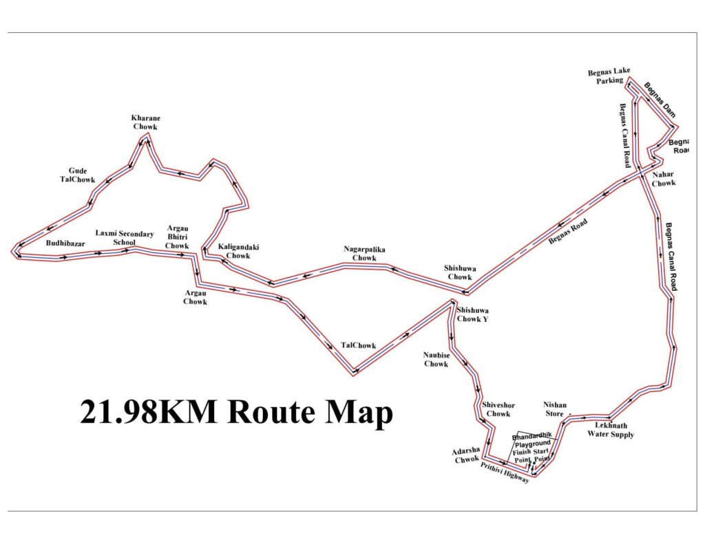 दौड लेखनाथ रंगशालाबाट शुरु खल्याँड लेखनाथ साना तथा शहरी खानेपानी, बेगनासताल, पार्किङबाट ड्यामहुदै बेगनास बसपार्क, शिशुवा, कविशिरोमणि गेटहुदै कालीगण्डकी चोक पुग्ने छ । त्यसपछि खास्टेताल चोक, बुढीबजार सिमलमार्ग लक्ष्मीमावि हुदैं लेखनाथ चोक, डाडाँनाकबाट तालचोक, शिशुवा, नौविसे आदर्शचोक निस्केर भण्डारढीकस्थित लेखनाथ रंगशालामा पुगेर दौड टुंगिने छ ।