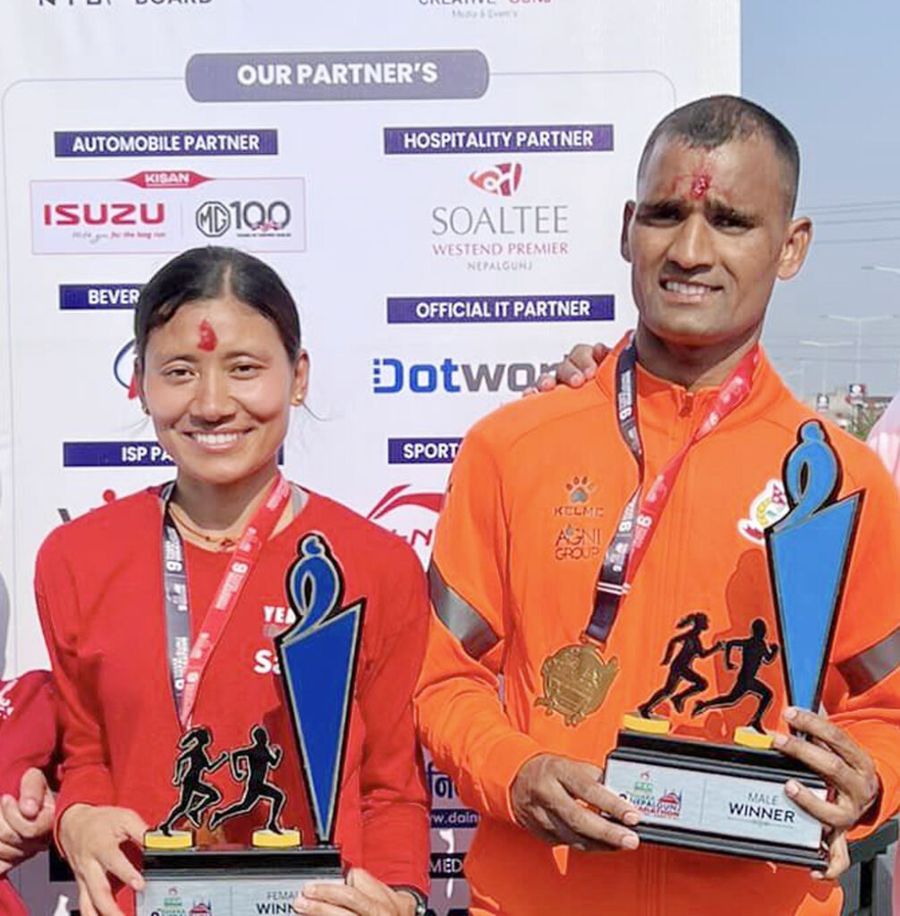 नेपालगन्ज-सशस्त्र प्रहरीबलका धावक गोपीचन्द्र पार्कीले दोस्रो पटक नवौं धारा नेपालगन्ज म्याराथनको उपाधि जित्दा सन्तोषी श्रेष्ठले भने उपाधिमा ह्याट्रिक गरेकी छन् । शनिबार नेपालगन्जमा आयोजित म्याराथनमा पार्कीले गतवर्षका विजेता नेपाली सेनाका धावक खड्कबहादुर खड्कालाई पछि पार्दै नगद दुईलाख राशीको पुरस्कार थापे । पार्कीको यो दोस्रो उपाधि समेत हो । उनले यसअघि छैटौं नेपालगन्ज म्याराथनको उपाधि जितेका छन् ।