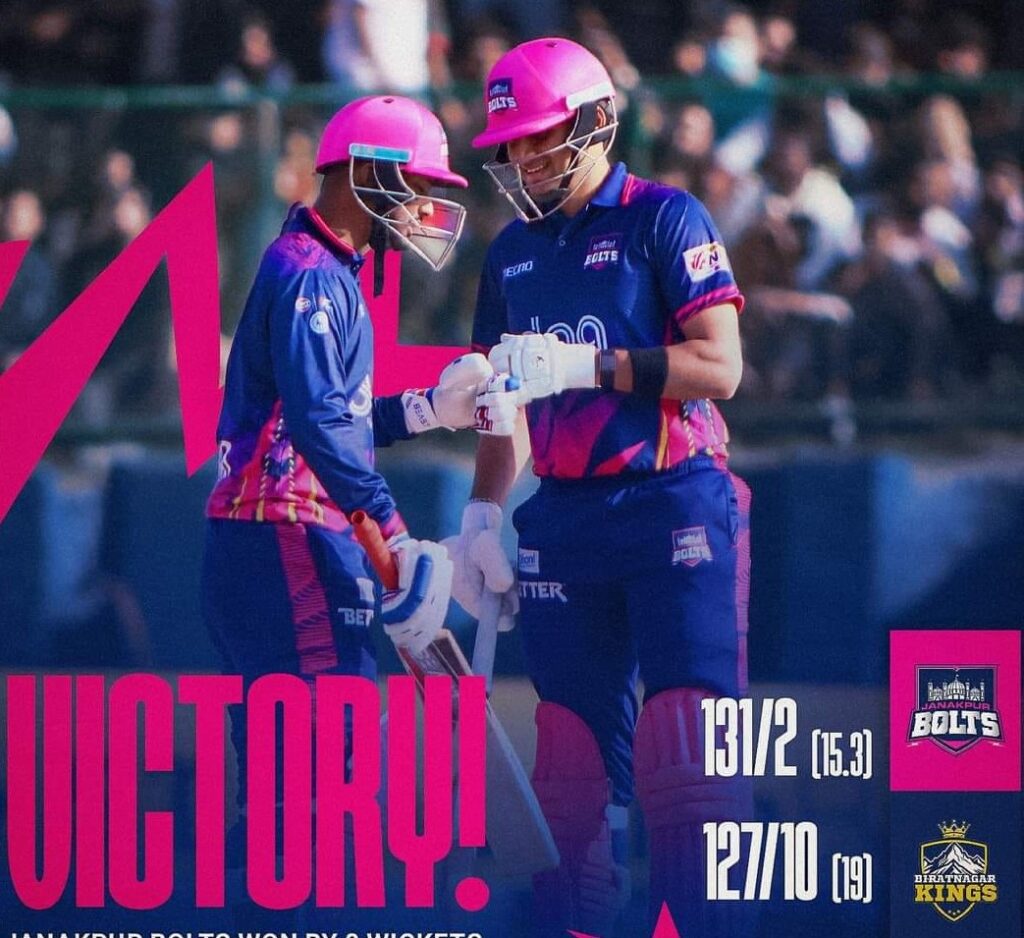 पोखरा-विराटनगर किंग्सलाई ८ विकेटले पराजित गर्दै नेपाल प्रिमियर लिग (एनपीएल)मा जनकपुर बोल्ट्सले गर्दै सुखद शुरुवात गरेको छ । जितको हकदार बनाउने क्रमममा मिलान्था र हर्स ठाकरको महत्वपूर्ण साझेदारी रह्यो । मिलान्थाले ५३ बल खेल्दै ९ चौका र ३ छक्का मद्दतमा अविजित ७५ रन बनाए । उनलाई साथ दिएका थाकरले ३३ बलमा अविजित २६ रन बनाएपछि विराटनगर किंग्सले दिएको १२७ रनको लक्ष्य जनकपुरले १५ ओभर ३ बलमा २ विकेट गुमाउँदै पुरा गर्यो ।