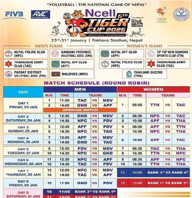 पोखरा-टाईगर ग्रुप अफ नेपाल पोखराको आयोजनामा शुक्रबारदेखि शुरु हुने छैटौं एनसेल टाईगर कप भलिबल प्रतियोगिताको खेल तालिका सार्वजनिक गरिएको छ ।